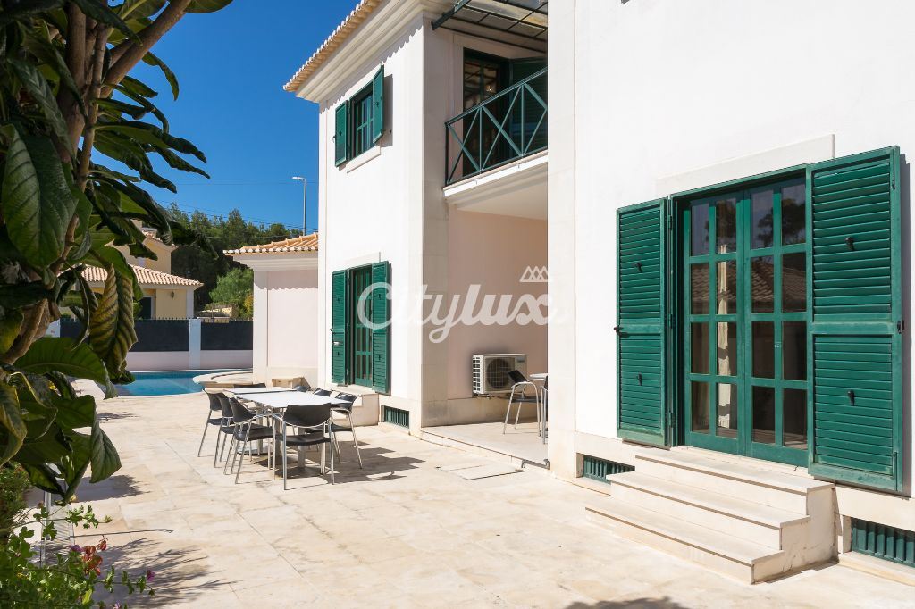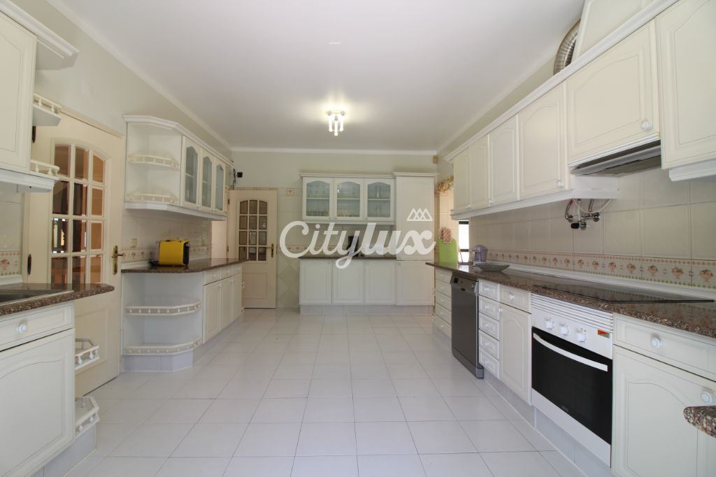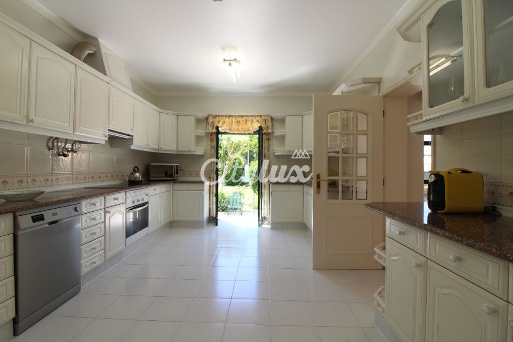 No r/c, há uma sala de estar com 32m2 e uma sala de jantar com 21m2 e acesso a um terraço e à piscina. Está também a cozinha com 21m2, totalmente equipada. Neste mesmo piso encontra-se um quarto com 14m2 e ainda um wc social.
