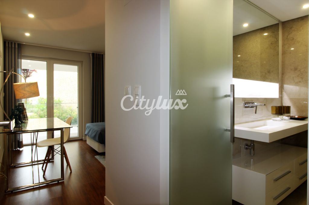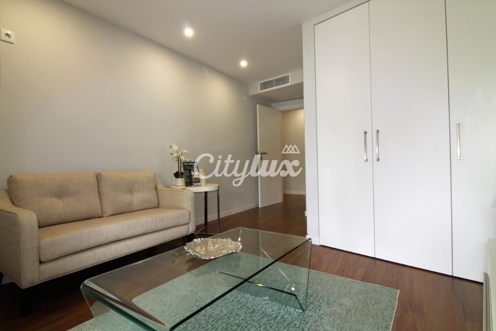 Apartamento acabado de construir com sala 35m² com varanda, cozinha totalmente equipada, suite 26m² com closet e roupeiros, quarto 18m² com roupeiros e varanda comum à suite, 2 wc’s completas e 2 Lugares em box.